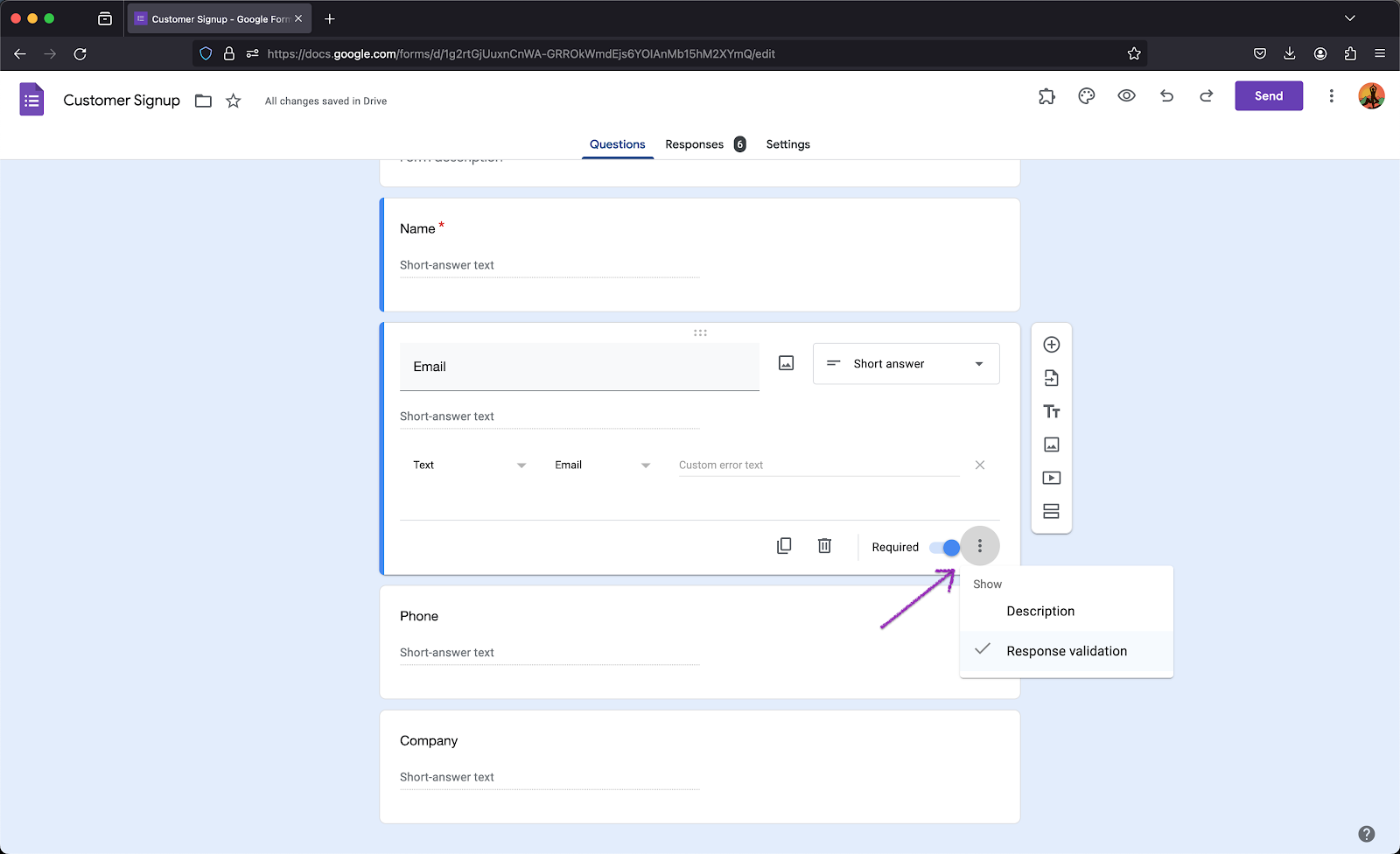 If you are creating your form in Google Forms, you can create rules that users have to follow when they fill out your form. For example, you can mark fields as required so that users don’t skip these fields. You can also add response validations to form fields so that the answers meet the specific criteria. For example, you can add a text email validation to ensure that the email address is properly formatted.