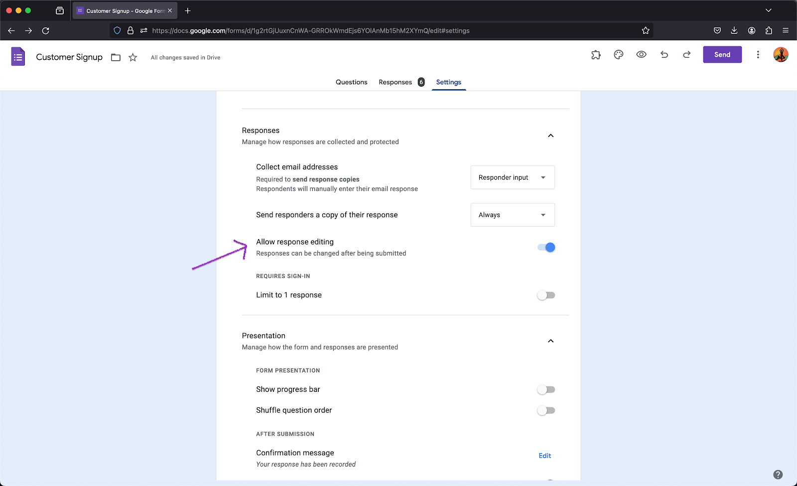 When the user submits the form, they will receive a confirmation with a copy of their response along with the edit response button. This will allow users to review their responses and make edits if required. It is important to note that the users will be able to make edits to their responses anytime.